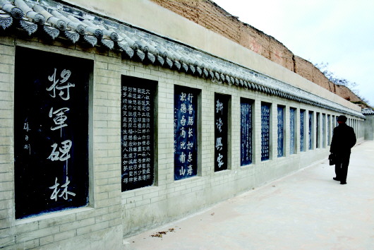 中岔古堡一堡三院,分為前院、中院、后院。走進古堡,堡門左側建有戲樓,上書“中岔劇場”四字。戲樓(又稱戲臺)始建于清光緒年間,上世紀六七十年代曾重修過。近堡門處右側堡墻下修建有兩處一體化的石碑長廊一直通向后院,碑廊中石碑一塊接著一塊砌筑在青磚墻內(nèi),石碑與石碑之間以青磚分隔,上覆筒瓦和滴水防護,每一通石碑上都刻有中華人民共和國將軍書寫的一幅書法作品。第一通石碑上甘谷籍將軍張臣剛書寫的“將軍碑林”四字分外醒目,劉精松、邢世忠、裴懷亮、李乾元等數(shù)十位叱咤風云的共和國將軍書寫的書法碑刻依次嵌進墻內(nèi),組成一個氣勢磅礴、雄偉壯觀的將軍書法長廊,這就是新建的將軍碑林。