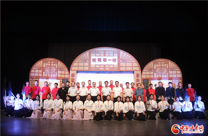 《隴原第一槍》全劇分希望、播火、誆宴、奪槍、功捷5場,演出團(tuán)隊(duì)分為前臺(tái)演唱組、樂隊(duì)伴奏組、影人挑纖組、嘛簧幫唱組,演職人員中有國家級(jí)非遺代表性傳承人2人,省級(jí)非遺代表性傳承人2人,市級(jí)、縣級(jí)代表性傳承人近10人,加上隴東音樂學(xué)院學(xué)生共50人參與了演出。