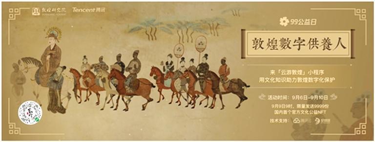 除了創(chuàng)意互動(dòng)帶來(lái)的新奇體驗(yàn),敦煌研究院與騰訊在“99公益日”還將發(fā)布文博行業(yè)首個(gè)公益NFT(Non-Fungible Token,非同質(zhì)化通證)藏品。9月9日9時(shí)開(kāi)始,用戶在“云游敦煌”小程序參與文化答題即有機(jī)會(huì)獲得這款限量數(shù)字藏品。這份NFT藏品生動(dòng)呈現(xiàn)了《張議潮統(tǒng)軍出行圖》與《宋國(guó)河內(nèi)郡夫人宋氏出行圖》壁畫的細(xì)節(jié),并首次讓用戶在線上觀看到敦煌莫高窟第156窟的全景。