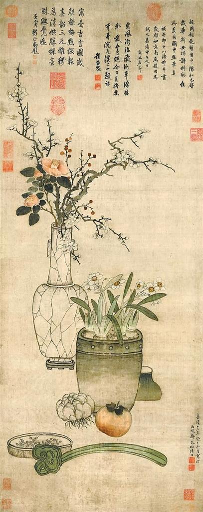 明代陸治的《歲朝圖》可以說(shuō)是入門(mén)級(jí)別的標(biāo)準(zhǔn)范本。白釉冰裂紋貫耳瓶中插梅、茶、天竹,乳釘弦紋盆中植水仙。盆花前是百合、柿子、如意組成的百事如意組合,如意后方的盤(pán)中盛穗,又合作歲歲如意。