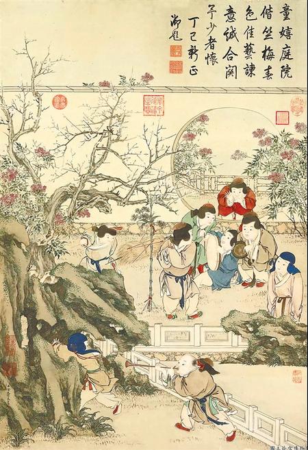 金廷標(biāo)的歲朝圖中,將嬰戲的場(chǎng)景置于種滿(mǎn)梅花和天竹的庭院中,小孩們敲鑼擊鼓吹嗩吶,洋溢著新春的吉慶熱鬧。
