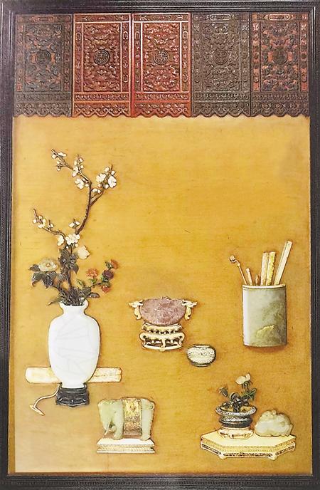 百寶嵌歲朝吉祥御制題詩(shī)掛屏,使用各種瓷、玉、寶石、金銀材料鑲嵌而成,也只有皇家才能制作。其中各部分零星擺放,相互之間無(wú)甚關(guān)聯(lián),已經(jīng)出現(xiàn)歲朝圖圖案化的苗頭。在后來(lái)的發(fā)展中,歲朝清供圖演變成裝飾圖案,出現(xiàn)在服飾、建筑等藝術(shù)中。
