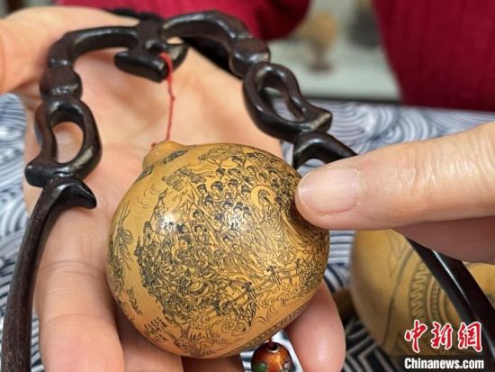 圖為長約二十公分的長條葫蘆雕刻佛教經(jīng)文作品。 張婧 攝