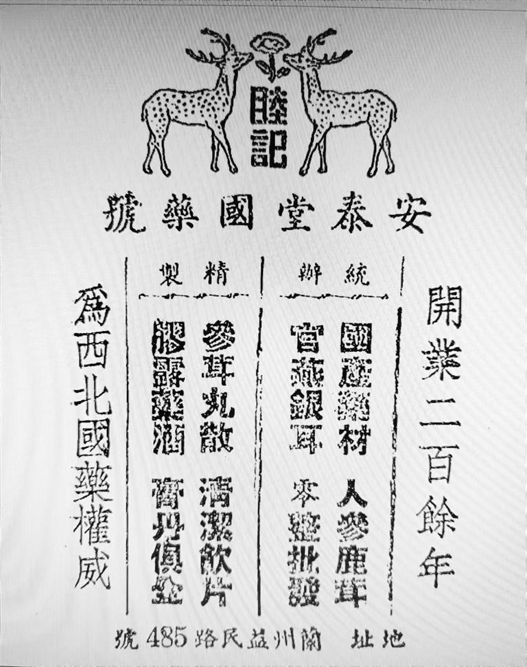 安泰堂作為百年老店,其廣告詞自然頗具氣場(chǎng)。首先明確定位:“開業(yè)二百余年、為西北國(guó)藥權(quán)威”,其次是統(tǒng)辦“國(guó)產(chǎn)藥材、人參鹿茸,官燕銀耳、零整批發(fā)”,最后是本店特色,精制“參茸丸散、清潔飲片,膠露藥酒、膏丹俱全”。