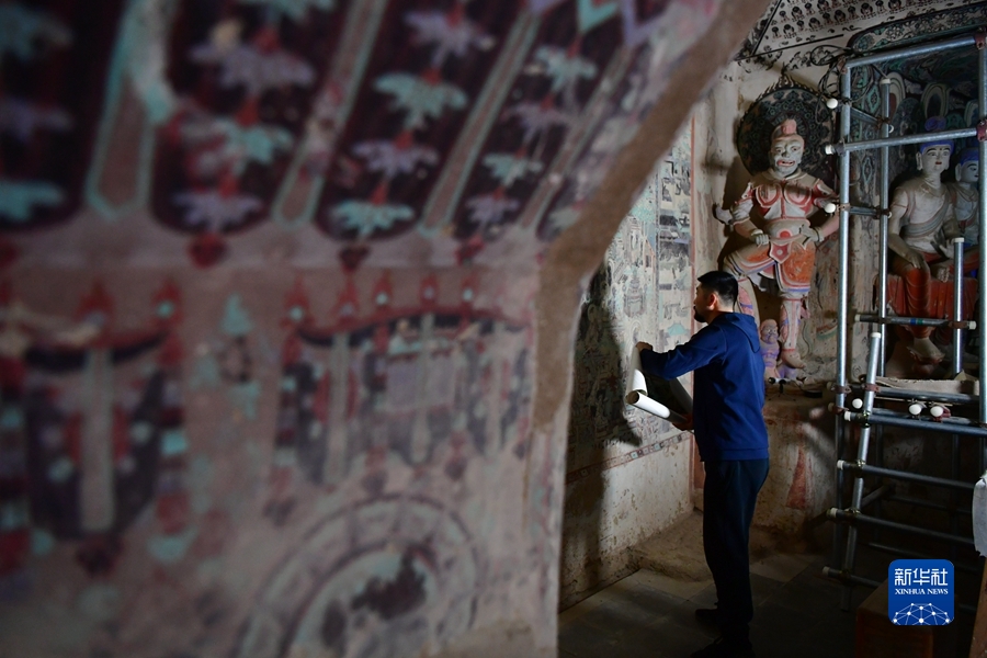 4月19日,在莫高窟第172窟,劉小同在對比臨摹壁畫的細節(jié)。新華社記者 杜哲宇 攝