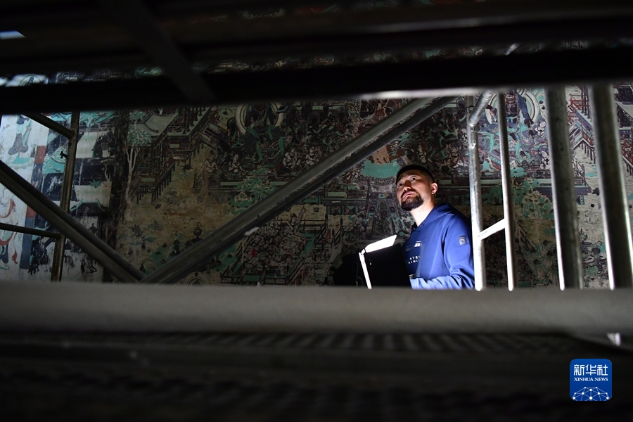楊金禮今年35歲,他2006年就來到莫高窟,從學(xué)徒做起,逐漸成長為敦煌研究院文物保護技術(shù)服務(wù)中心的一名壁畫修復(fù)工作者。楊金禮每天都會和同事來到洞窟內(nèi)“面壁修復(fù)”,通過專業(yè)技術(shù)手段解決壁畫產(chǎn)生的起甲、空鼓、酥堿等病害,幫助壁畫對抗時間的流逝。