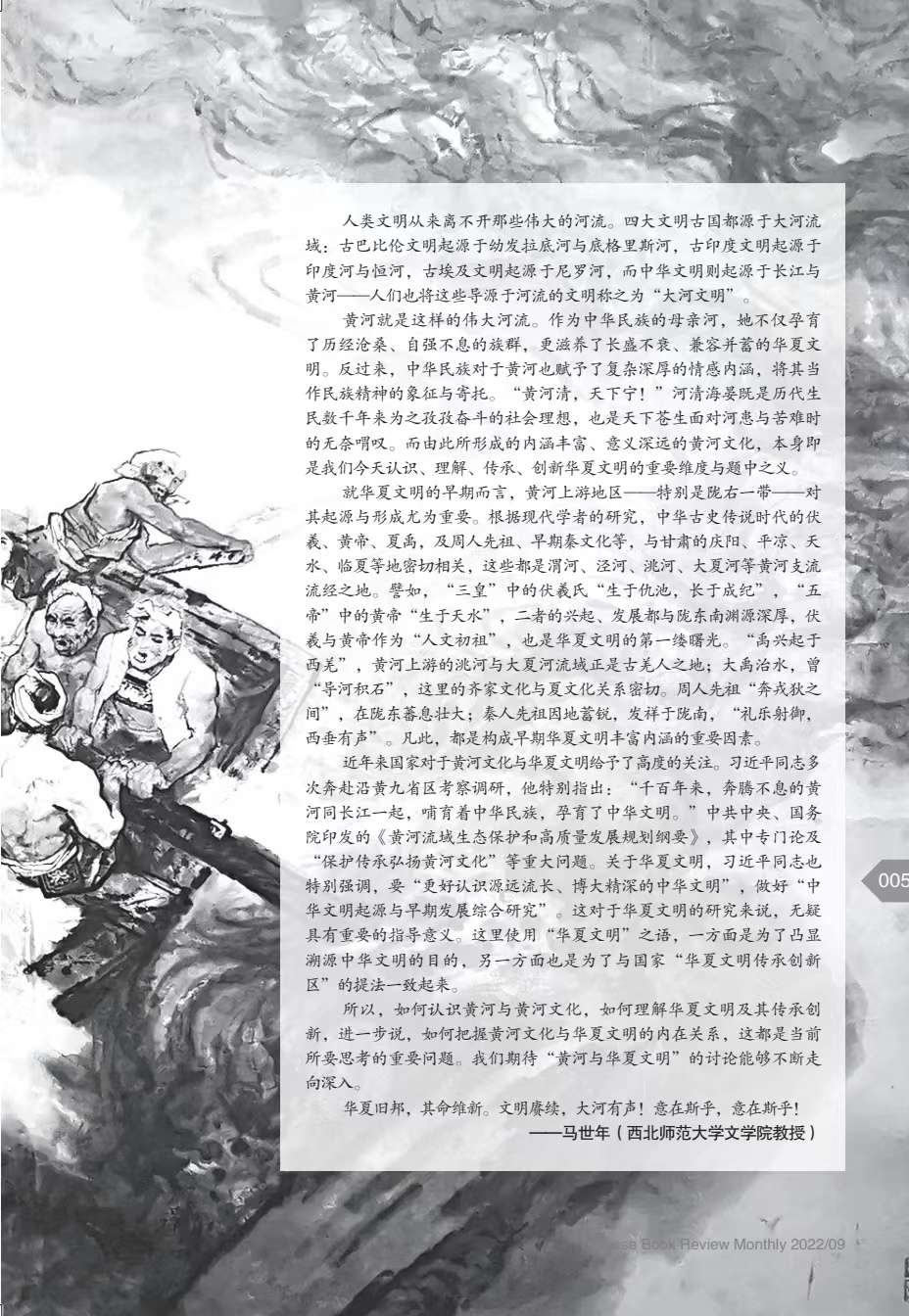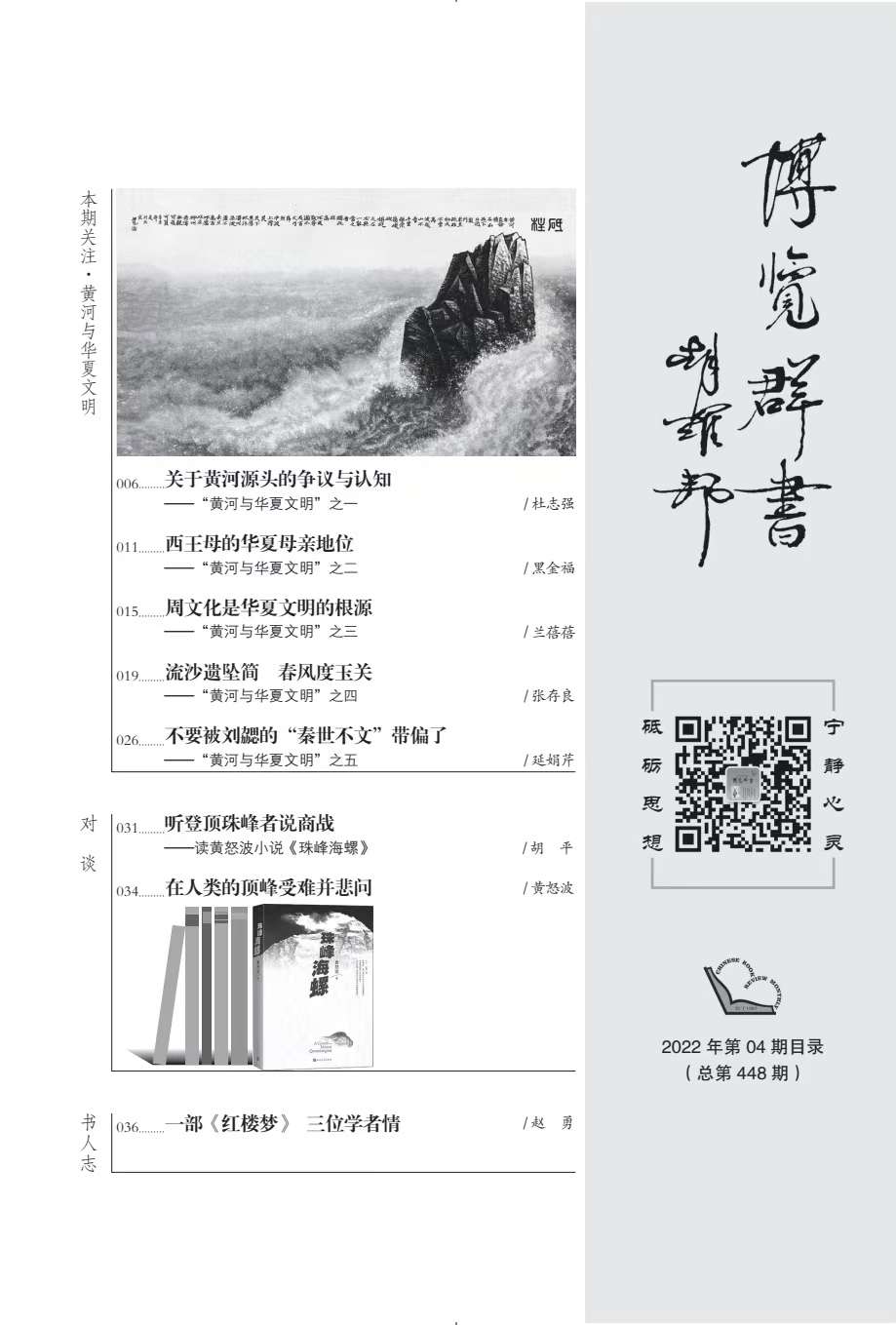“黃河與華夏文明”系列文章(共9篇),由《博覽群書》編輯部邀約西北師范大學(xué)文學(xué)院馬世年、杜志強(qiáng)等著名專家策劃、組稿,作者有馬世年、杜志強(qiáng)、張景平、延娟芹、張存良、黑金福、劉陽(yáng)杰、蘭蓓蓓等,分別刊發(fā)于《博覽群書》2022年3期、9期。系列文章著眼黃河文化,呼應(yīng)中央關(guān)于研究黃河文化的號(hào)召,探討華夏文明在黃河流域的發(fā)展、發(fā)生與傳承、創(chuàng)新;同時(shí),欄目通過精準(zhǔn)立意、深入考證和生動(dòng)表達(dá),卓有成效地推介和普及了黃河文化,深化了國(guó)人對(duì)黃河文化的認(rèn)識(shí)。已經(jīng)探討的相關(guān)論題有:歷史上關(guān)于黃河起源的爭(zhēng)議,黃河文化的內(nèi)涵,先周文化,秦早期文化,民族文化,西王母文化,絲路文化等。據(jù)《博覽群書》雜志介紹,鑒于這一主題的人文價(jià)值和巨大影響,編輯部將和學(xué)界更加密切配合,加強(qiáng)相關(guān)欄目,講好學(xué)術(shù)故事,推動(dòng)黃河文化研究形成新局面和新氣象。