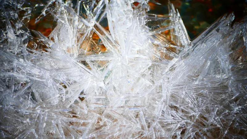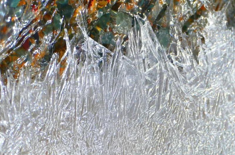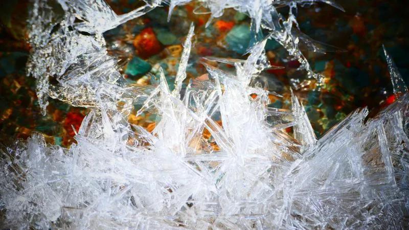在丹霞山間可見一條冰凍似凍的水溪,系小泉河支流,在陽光下透過像東北冬天窗花一樣的冰花,可看見水下的鵝卵彩石,望遠看去小溪像一條披上雪衣的彩龍。