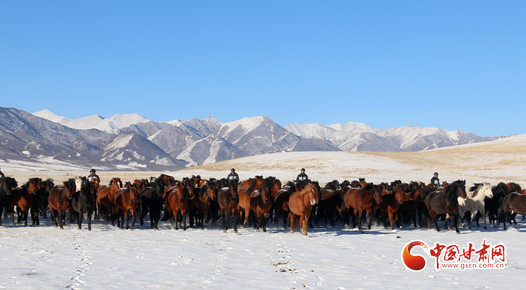 2月9日,在甘肅山丹馬場,上演了萬馬奔騰的壯觀景象,健壯的馬蹄濺起陣陣飛雪,實屬震撼。