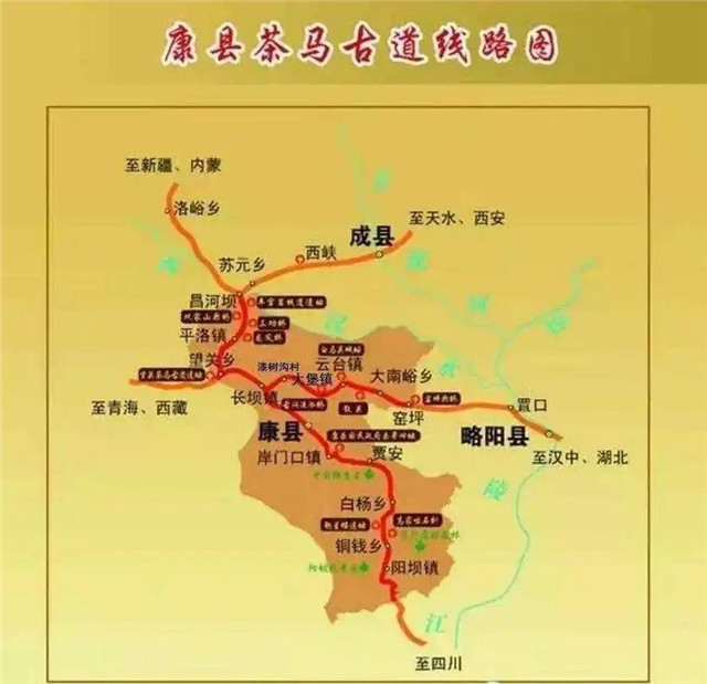 甘肅境內(nèi)的茶馬古道大致走向如下:茶葉由四川進(jìn)入文縣,沿白龍江到達(dá)武都,經(jīng)宕昌到岷縣進(jìn)而進(jìn)入藏族地區(qū);由陜西進(jìn)入隴南,經(jīng)成縣、西和到天水,經(jīng)甘谷、武山到達(dá)臨洮,在此可以分出兩條路徑,向北可達(dá)蘭州等地,往西可進(jìn)入臨夏,進(jìn)而進(jìn)入藏族地區(qū)。