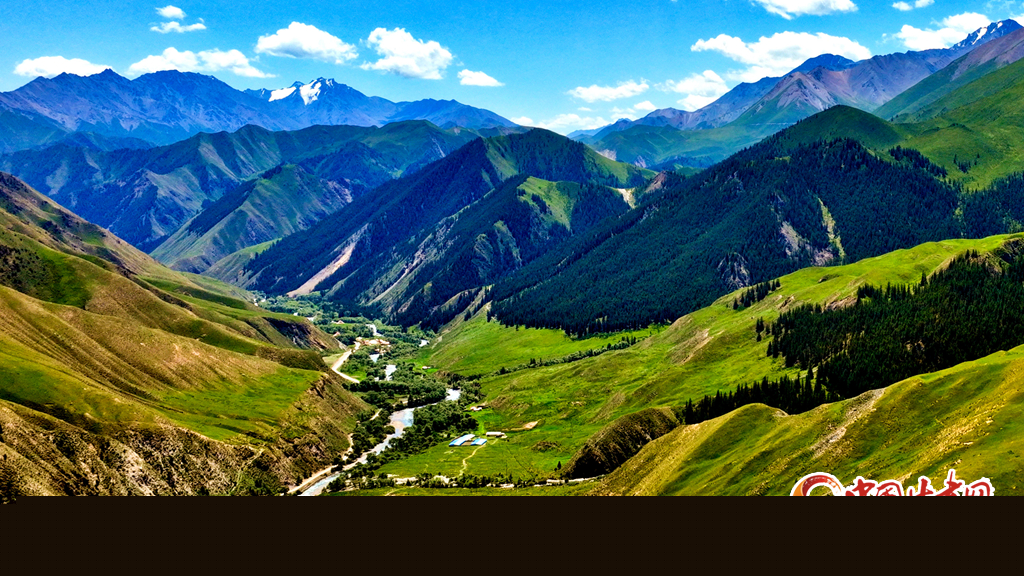 7月22日,祁連山國家公園甘肅省張掖市肅南裕固族自治縣大河鄉(xiāng)段,藍天白云下,巍峨壯麗的祁連山蒼松翠柏矗立其間,綠草如茵、水光粼粼,如同一幅壯美與秀麗并存的山水畫卷。