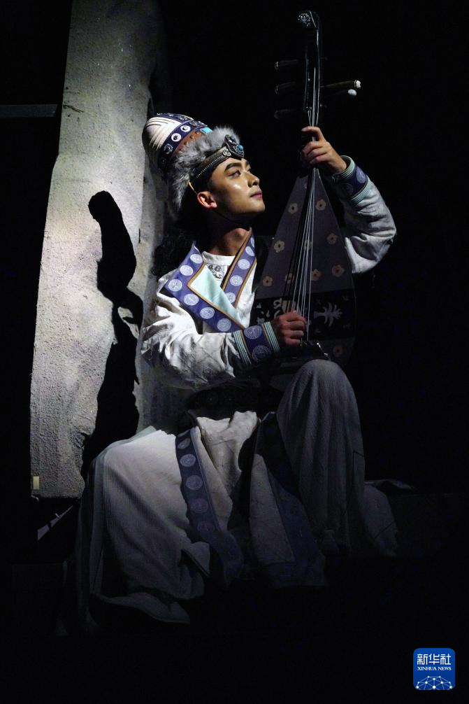8月9日,在《樂動敦煌》演出現(xiàn)場,敦煌古樂全球推廣大使、國樂藝術(shù)家方錦龍演奏琵琶,為舞蹈演員伴奏。新華社記者 馬寧 攝
