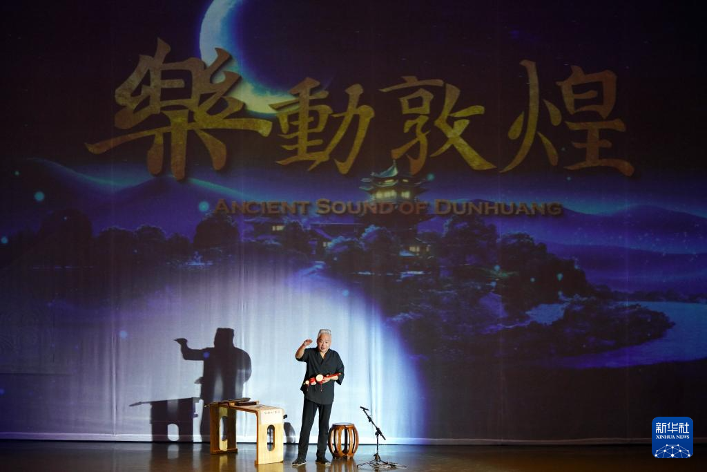 8月9日,在《樂動敦煌》演出現(xiàn)場,敦煌古樂全球推廣大使、國樂藝術(shù)家方錦龍?jiān)谙蛴^眾介紹傳統(tǒng)音樂。新華社記者 馬寧 攝