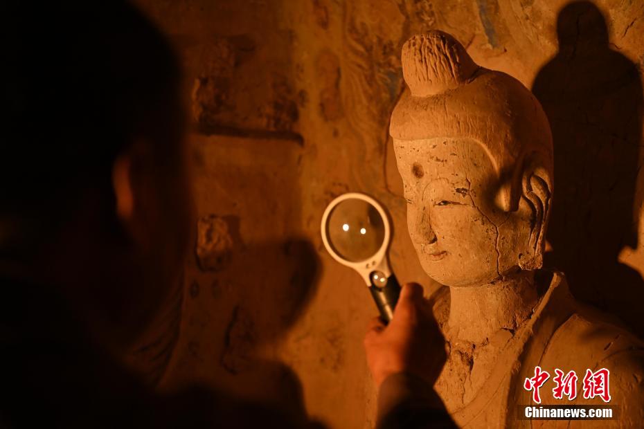 有時(shí)候看似簡(jiǎn)單的佛像修復(fù)會(huì)遇到各類不同的文物病害,修復(fù)時(shí)間會(huì)長(zhǎng)達(dá)三年之久,他也見證了文物修復(fù)技藝的變遷。隨著科技進(jìn)步文物修復(fù)手段也變得越來越先進(jìn),他認(rèn)為未來的文物保護(hù)工作一定會(huì)越來越好,年輕文保工作者們也一定會(huì)想盡更多辦法留住這座世界文化遺產(chǎn)。圖為8月25日,文物修復(fù)師牟常有正在仔細(xì)觀察佛像表面出現(xiàn)的病害問題。李亞龍 攝