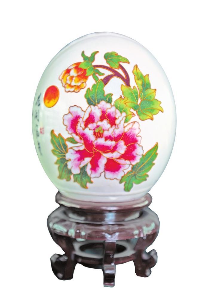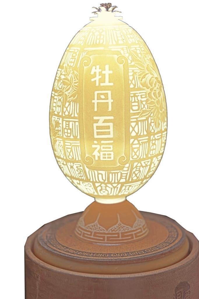 楊星國雕刻過的作品達兩千多件,作品《牡丹亭》是他用最新的拼雕手法創(chuàng)作的,鴕鳥蛋殼細分成300片,打磨成“瓦片”樣,逐片貼成古建筑中亭頂蓋狀,形成牡丹亭之樣,做成外層的“亭”;內(nèi)層的“牡丹”則用鴯鹋蛋殼,利用其自然色,依照牡丹層層雕透,第一層深墨、第二層墨綠、第三層淡綠、第四層白色從外到內(nèi)雕刻,作品既有國畫的神韻又有雕刻的立體藝術之美。浮雕、陰雕、陽雕、鏤空雕、拼雕等手法,在《牡丹亭》作品里全部顯現(xiàn)。為了讓作品表達的效果更充分,楊星國又加了一些機械原理讓其旋轉,還加了燈光,于是,3個鴕鳥蛋殼與1個鴯鹋蛋殼在楊星國的巧妙構思中有了全新的生命。