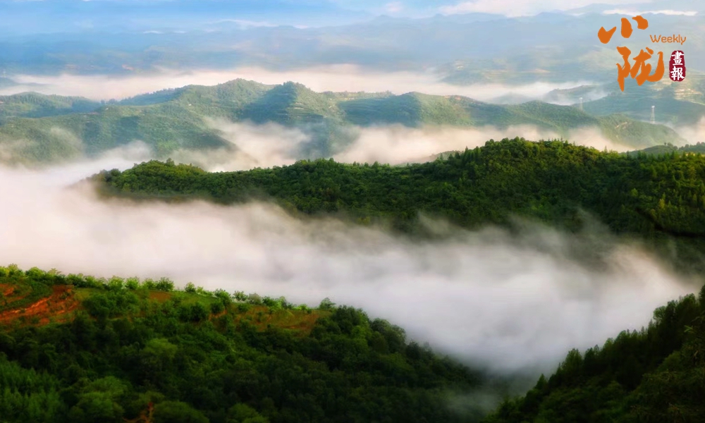 連綿起伏的山巒被綠色包裹,群峰之間薄霧繚繞,天光云影,如畫仙境。