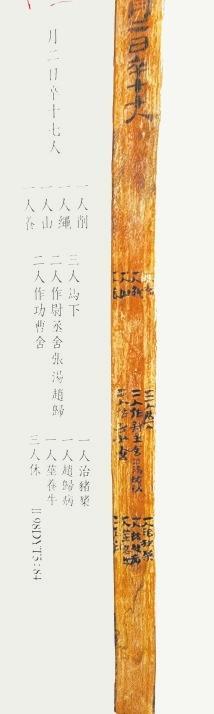 簡8是某月2日,17名戍卒勞作記錄。削同削工。繩,搓麻繩。一人山,缺當時語言環(huán)境,不可釋。養(yǎng),烹煮,做飯。三人馬下,同簡7中的“一人馬下”。尉丞、功曹是都尉府中下級軍官職稱。尉丞舍、功曹舍,舍,宿舍,4名戍卒分別維修、加固尉丞和功曹的宿舍。橥,是拴牲口的木樁,治豬橥,即用木樁圍豬欄,說明玉門都尉府養(yǎng)豬。莝,鍘草,莝養(yǎng)牛,即鍘草養(yǎng)牛,說明玉門都尉府養(yǎng)牛。