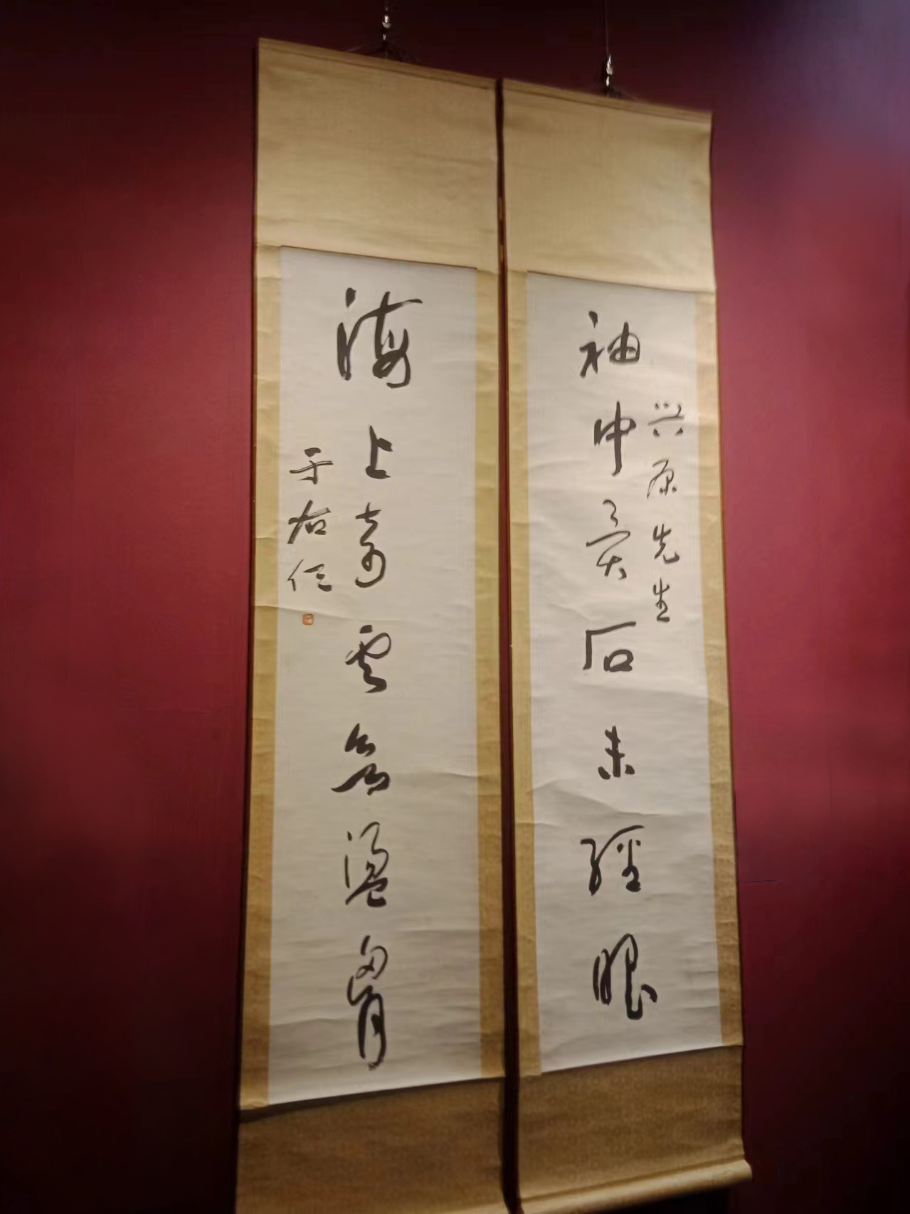 這次展出的于右任先生書法十余幅,有草書、行書和楷書。草書古詩“蜀本九經(jīng)最先出,后來孳乳到長興。蒲津毋氏家錢造,海內(nèi)通行價倍增(此幅落款‘五十一年’,應是1962年先生去世前的作品)”,行書七言聯(lián)“袖中異石未經(jīng)眼,海上奇云未蕩胸”,楷書七言聯(lián)“萬卷藏書宜子弟,十年種木長風煙”等,書藝嫻熟,各有特色。所展墨寶筆法老練,墨氣逼人,筆者懷著崇敬的心情駐足敬賞,猶如與先生會面,久久不忍離去。