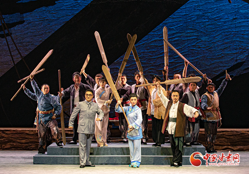 隴劇《大河?xùn)|流》于19日晚在甘肅黃河劇院成功首演。該劇以20世紀(jì)30年代末抗戰(zhàn)為背景,運用具有地方特色的隴劇形式,生動地描繪了大西北黃河邊的一群筏客子在國家危難之際,如何放下個人恩怨,團結(jié)起來支援抗戰(zhàn),組成水上大型運輸隊,將大量物資安全送達抗戰(zhàn)前線,創(chuàng)造了“羊皮筏子賽軍艦”的傳奇故事。(甘肅省隴劇院供圖)