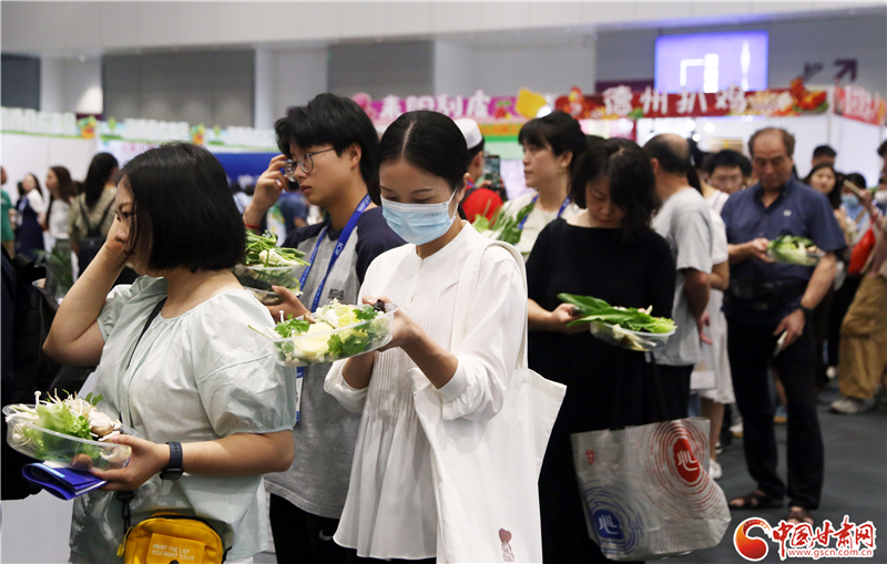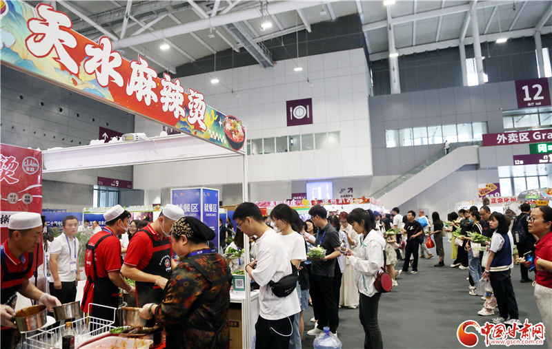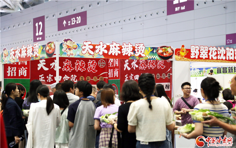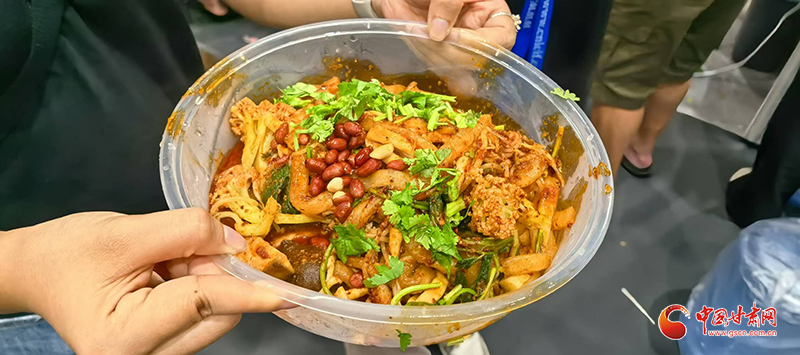 記者在現(xiàn)場看到,前往蘭州牛肉面、天水麻辣燙兩個展區(qū)品嘗美食的游客絡(luò)繹不絕。特別是在天水麻辣燙展區(qū),端著裝有各類蔬菜菜盆的食客排起了長隊(duì),紛紛翹首以盼,期待蔬菜下鍋,一嘗“麻”“辣”美味。
