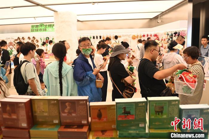 6月19日,甘肅省博物館藝術(shù)生活館在甘肅蘭州開館。該館是甘肅省博物館打造的一處復(fù)合型高價(jià)值文化空間,融合了咖啡、烘焙、展覽、藝術(shù)書店、文創(chuàng)銷售等多樣化業(yè)態(tài)。圖為游客挑選蘭州凍梨文創(chuàng)玩偶。中新社記者 李亞龍 攝