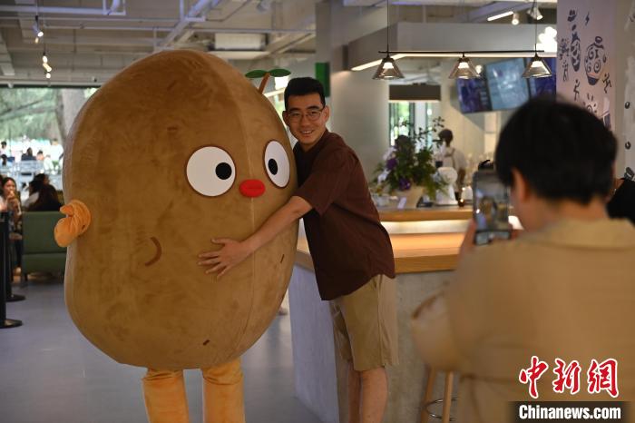 6月19日,甘肅省博物館藝術(shù)生活館在甘肅蘭州開館。該館是甘肅省博物館打造的一處復(fù)合型高價(jià)值文化空間,融合了咖啡、烘焙、展覽、藝術(shù)書店、文創(chuàng)銷售等多樣化業(yè)態(tài)。圖為顧客與蘭州凍梨文創(chuàng)真人玩偶合影。中新社記者 李亞龍 攝