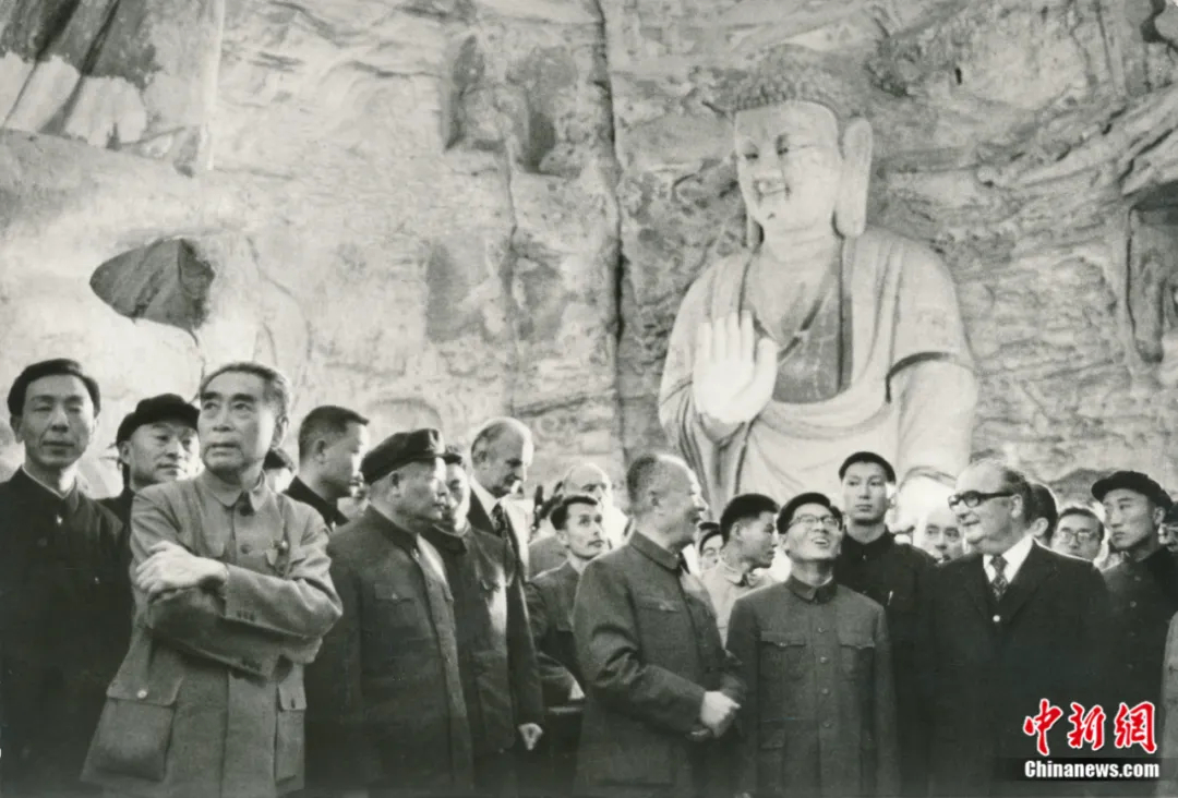 1973年9月15日,周恩來總理陪同時(shí)任法國總統(tǒng)喬治·蓬皮杜視察云岡石窟。云岡研究院 供圖