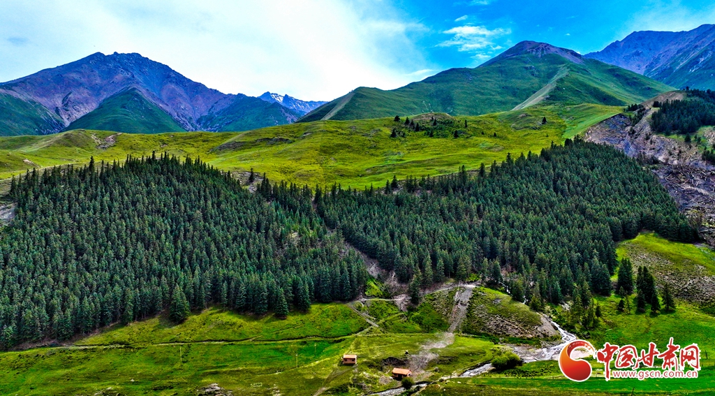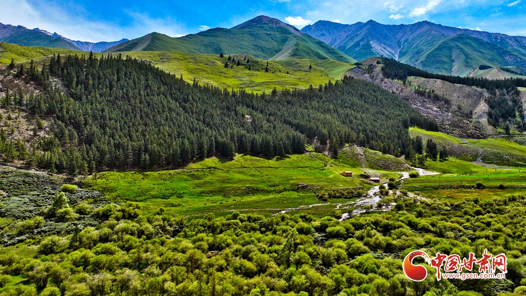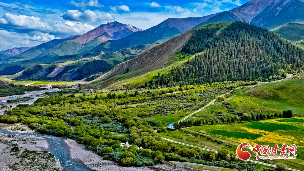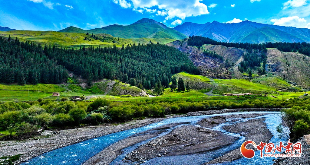 7月2日,祁連山國(guó)家公園甘肅省張掖市肅南裕固族自治縣大河鄉(xiāng)段,在高原藍(lán)天白云映襯下,群山環(huán)抱、 雪峰高聳,鳥(niǎo)鳴聲陣陣的濕地、奔騰不歇的黑河水、猶如“巨幅綠毯”的草原,勾勒出一幅風(fēng)光壯美的生態(tài)畫卷。