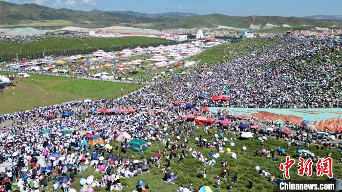 8月4日,人們?cè)诋?dāng)周草原觀看九色甘南香巴拉旅游藝術(shù)節(jié)開幕式表演。當(dāng)日,第22屆九色甘南香巴拉旅游藝術(shù)節(jié)在甘肅省甘南藏族自治州當(dāng)周草原開幕。人們身著節(jié)日盛裝載歌載舞、歡聚一堂,馬隊(duì)巡游、千人鍋莊舞等活動(dòng)精彩上演。九色甘南香巴拉旅游藝術(shù)節(jié)既是民眾浪山聚會(huì)的節(jié)日盛會(huì),也是展現(xiàn)發(fā)展成就、擴(kuò)大對(duì)外開放的重要窗口,更是展示民俗文化、促進(jìn)廣泛交往交流交融的有效載體。(無(wú)人機(jī)照片)中新社記者 九美旦增 攝
