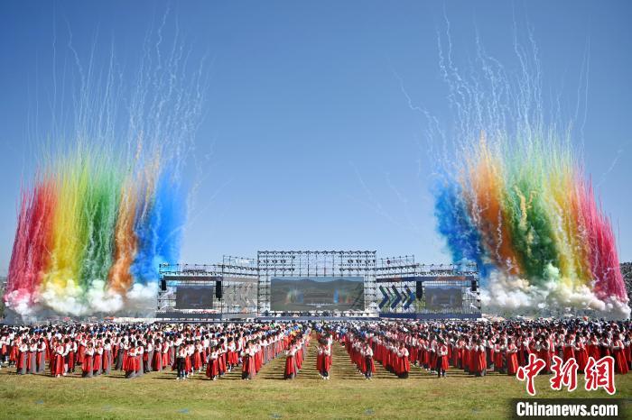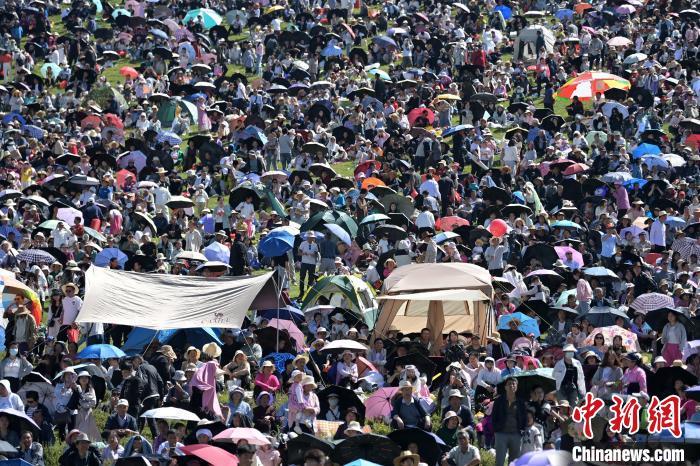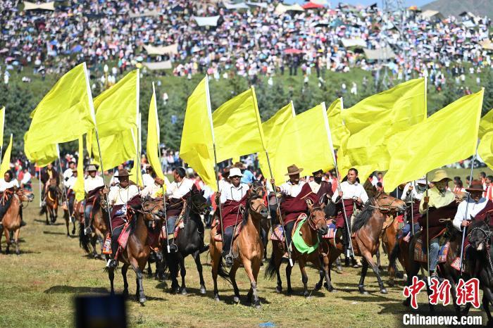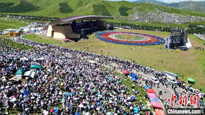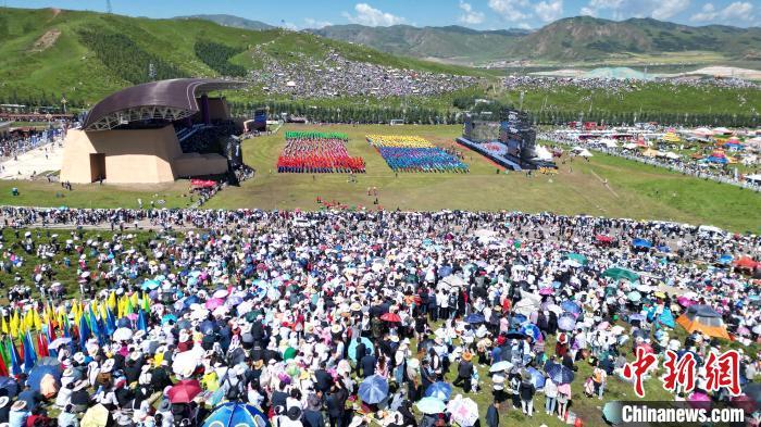 8月4日,第22屆九色甘南香巴拉旅游藝術(shù)節(jié)在甘肅省甘南藏族自治州當(dāng)周草原開幕。人們身著節(jié)日盛裝載歌載舞、歡聚一堂,馬隊(duì)巡游、千人鍋莊舞等活動(dòng)精彩上演。九色甘南香巴拉旅游藝術(shù)節(jié)既是民眾浪山聚會(huì)的節(jié)日盛會(huì),也是展現(xiàn)發(fā)展成就、擴(kuò)大對(duì)外開放的重要窗口,更是展示民俗文化、促進(jìn)廣泛交往交流交融的有效載體。圖為開幕式現(xiàn)場(chǎng)。中新社記者 九美旦增 攝