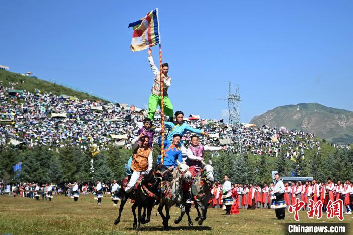 8月4日,藏族騎手在當(dāng)周草原上表演馬術(shù)。當(dāng)日,第22屆九色甘南香巴拉旅游藝術(shù)節(jié)在甘肅省甘南藏族自治州當(dāng)周草原開幕。人們身著節(jié)日盛裝載歌載舞、歡聚一堂,馬隊(duì)巡游、千人鍋莊舞等活動(dòng)精彩上演。九色甘南香巴拉旅游藝術(shù)節(jié)既是民眾浪山聚會(huì)的節(jié)日盛會(huì),也是展現(xiàn)發(fā)展成就、擴(kuò)大對(duì)外開放的重要窗口,更是展示民俗文化、促進(jìn)廣泛交往交流交融的有效載體。中新社記者 九美旦增 攝