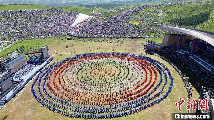 8月4日,第22屆九色甘南香巴拉旅游藝術(shù)節(jié)在甘肅省甘南藏族自治州當(dāng)周草原開幕。人們身著節(jié)日盛裝載歌載舞、歡聚一堂,馬隊(duì)巡游、千人鍋莊舞等活動(dòng)精彩上演。九色甘南香巴拉旅游藝術(shù)節(jié)既是民眾浪山聚會(huì)的節(jié)日盛會(huì),也是展現(xiàn)發(fā)展成就、擴(kuò)大對(duì)外開放的重要窗口,更是展示民俗文化、促進(jìn)廣泛交往交流交融的有效載體。圖為開幕式現(xiàn)場(chǎng)千人鍋莊舞表演。(無(wú)人機(jī)照片)中新社記者 九美旦增 攝