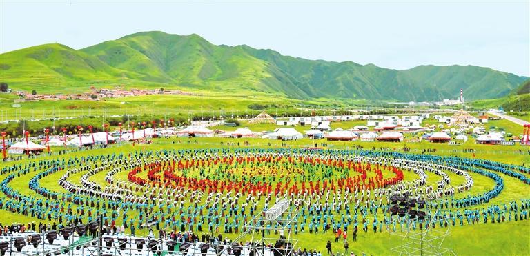 壯觀的萬人鍋莊舞展演在碌曲縣夏澤灘草原上演。新甘肅·甘肅日報記者 馬伊星