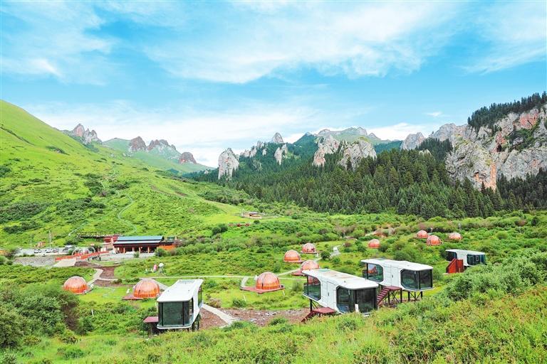 夏河縣的??撇菰?,游人在山間草場、樹林河邊支起一頂頂帳篷,白天品著飄香的奶茶,晚上躺在草地上仰望星空,很是愜意。