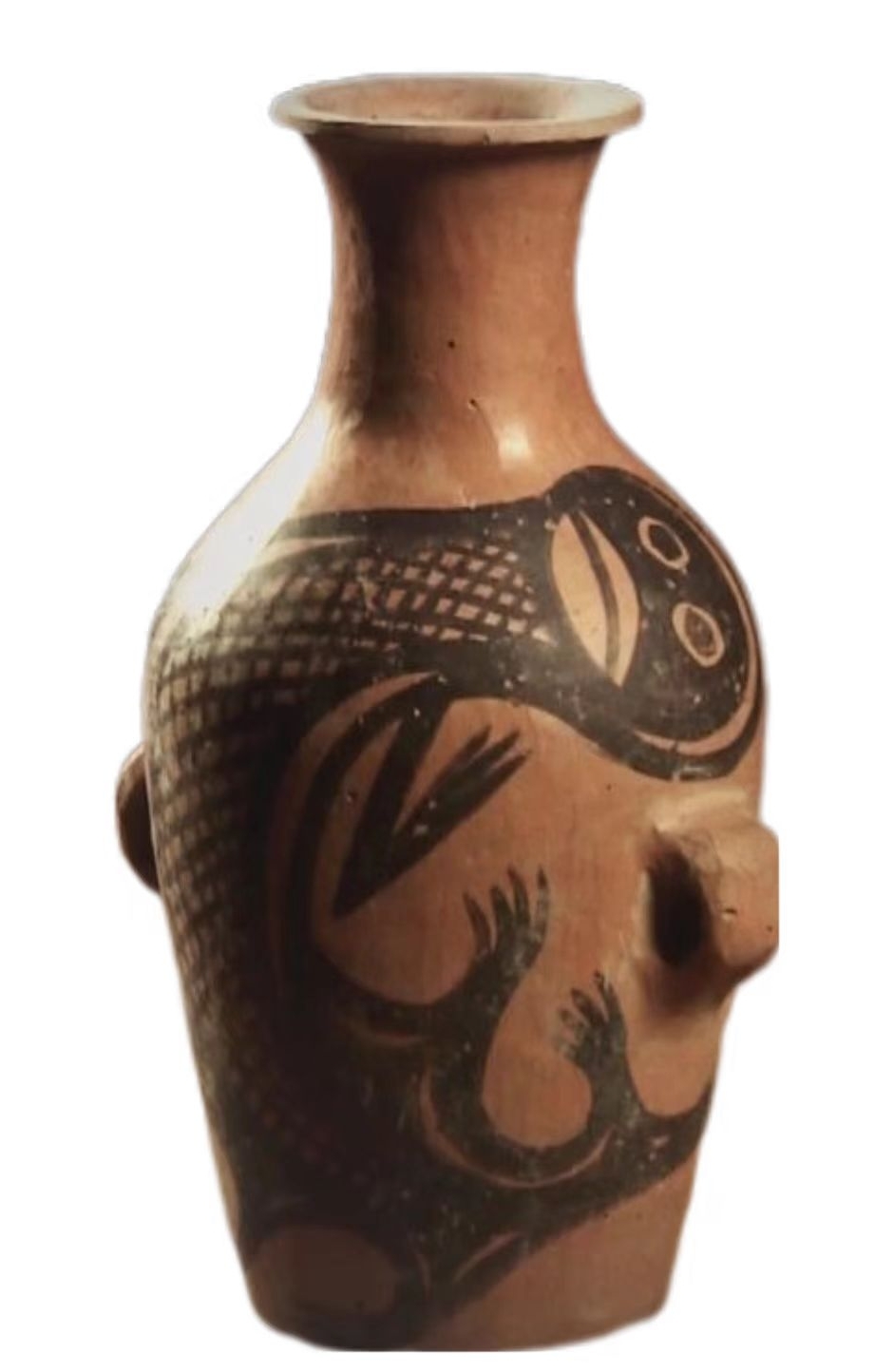 這件鯢魚紋彩陶瓶為泥質(zhì)紅陶,高18.5厘米,口徑寬5.7厘米,底徑7厘米,腹徑14厘米,重430克。陶瓶最顯著的特征是在腹部繪有動(dòng)物圖紋。動(dòng)物的身子呈蜷曲狀,尾巴向上翹舉,交于頭上。臉?biāo)迫嗣?,雙眼圓睜而有神。嘴巴寬闊,顎下有須,頭頂兩側(cè)有伸出的節(jié)肢狀腮。奇怪的是,它只有一對(duì)前肢,肢端有張開的四肢。陶瓶身上繪制有網(wǎng)格狀的線紋。線條流利而生動(dòng),變化豐富,展現(xiàn)出了熟練自如的繪畫技巧。從鯢魚圖案的繪制來(lái)看,紋飾用筆鋒畫作的線條遒勁有力,頓挫有致。粗細(xì)不同的線條之間,還凸顯出了圖紋部位的主次。彩陶的出現(xiàn),也似乎在見證著先祖?zhèn)冊(cè)谑庝离x居、不常厥邑的歲月中所經(jīng)歷的那些艱難生活。