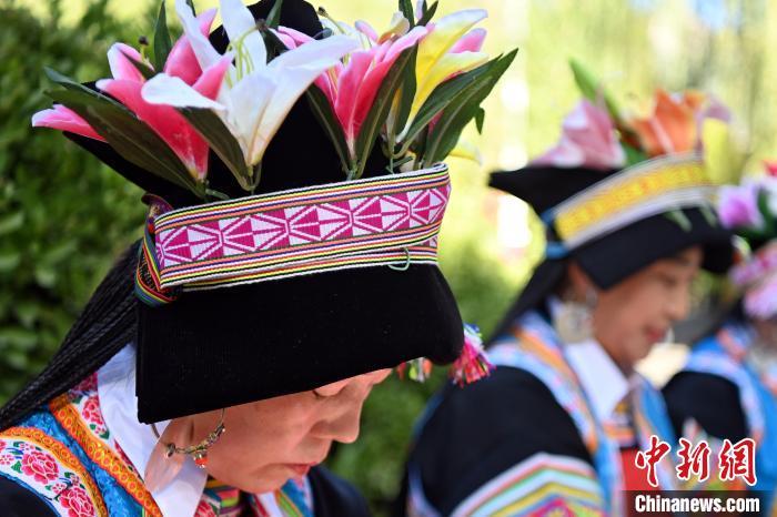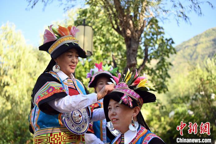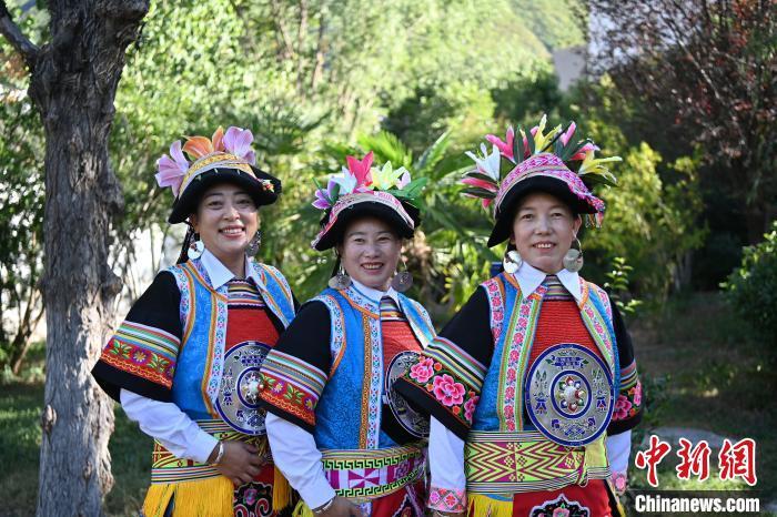 9月26日,甘肅省甘南藏族自治州舟曲縣,當(dāng)?shù)夭刈鍕D女展示錦帶佩戴方式。錦帶是舟曲藏族婦女用以束腰、扎靴、攏發(fā)乃至點(diǎn)綴服飾的花帶子,艷麗多彩、圖案優(yōu)美。每逢吉慶節(jié)日,藏族婦女穿戴的華麗盛裝就需要少則五、六條,多則十幾條寬窄長短相宜的錦帶來裝飾。據(jù)介紹,藏族織錦帶技藝歷史悠久,一千多年以前,古羌族和吐蕃已有了較發(fā)達(dá)的手工編織技術(shù),在艱難的生活條件下對服飾等生活用品除實(shí)用功能之外,已經(jīng)有了強(qiáng)烈的審美追求,是研究舟曲羌藏文化的“活化石”。中新社記者 九美旦增 攝