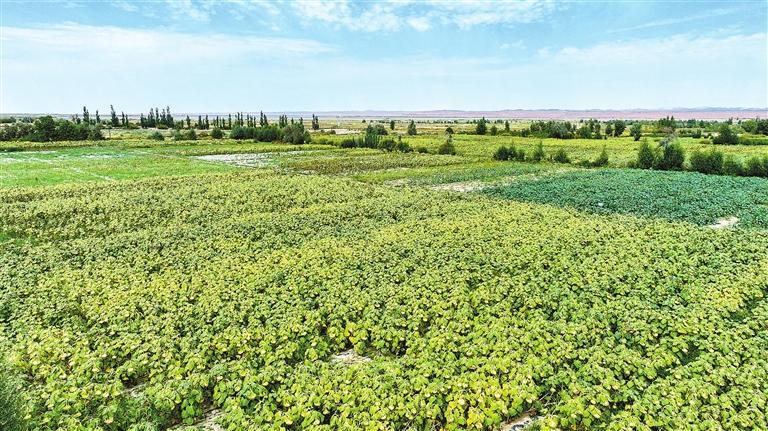 金塔縣航天鎮(zhèn)營盤村重度鹽堿耕地綜合治理利用核心示范點(diǎn)綠意盎然,向日葵、蓖麻、高粱等作物長勢喜人。