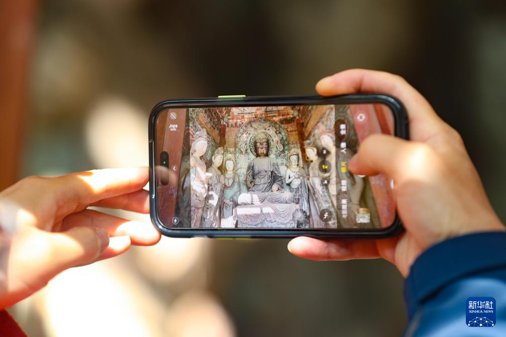 11月2日,游客在麥積山石窟參觀游覽時(shí)用手機(jī)拍攝開放洞窟彩塑。新華社記者 郎兵兵 攝