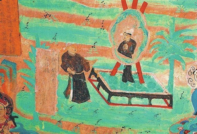 戰(zhàn)國(guó)時(shí)期楚國(guó)詩(shī)人屈原在《漁父》一文中寫道:“吾聞之,新沐者必彈冠,新浴者必振衣。安能以身之察察,受物之汶汶者乎?”意思是說我聽說剛洗過頭的人一定會(huì)去彈彈帽子上的灰塵;剛洗過澡的人一定要抖抖衣服的灰塵。怎能讓清白的身體去接觸世俗塵埃的污染呢?當(dāng)年的敦煌人走出溫泉,在身心放松之后,就該靜觀返照自己了。在莫高窟第85窟中有一幅“曲花式鏡圖”:畫面上在一個(gè)正方形鏤空的底座上擺放著一個(gè)巨大的曲花式鏡,鏡子式樣別致,明亮澄澈。藍(lán)色的曲花式樣引人矚目。但畫面上最吸睛的是一位魁梧俊朗身著一襲赭色長(zhǎng)袍的男子,他正在鏡子前仔細(xì)地打量自己,而鏡中映射出他神情凝重的情態(tài)來。原來,古人照鏡除了正衣冠之外,還有反觀自照的含義,在鏡子前良久地注視自己,就是對(duì)自己反省、頓悟的過程。“一年好景君須記”,走過四季,到了歲末,該是每個(gè)人回望來時(shí)路,展望前方的時(shí)候了。