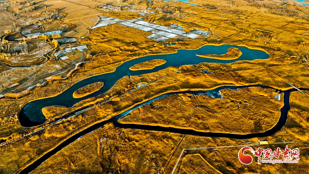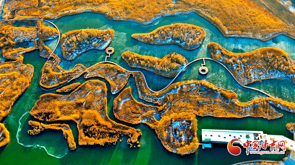 12月1日,俯瞰甘肅張掖國家濕地公園,夕陽余暉映照,金色茂密的蘆葦隨風(fēng)搖曳,蘆花翩翩起舞,碧波蕩漾的水面逐漸凝結(jié)成冰,整個(gè)濕地化作一片金色的童話仙境,令人陶醉于無盡的遐想之中。