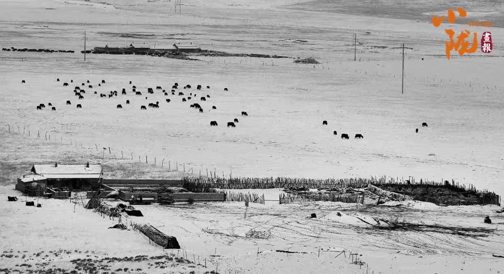 天空陰沉,雪花依舊飄落,分散在雪地中的牦牛群,悠然自得地啃食著牧草,寒冷的天氣仿佛對(duì)它們毫無影響。