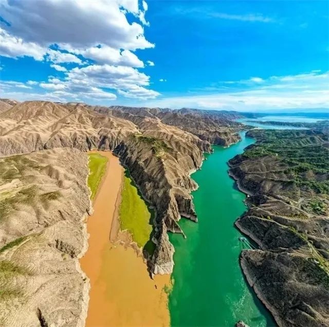 在永靖縣劉家峽大壩附近,黃河與洮河以“Y”字形交匯,形成了“黃洮交匯”的奇觀。黃河水清澈碧藍(lán),而洮河則因攜帶大量泥沙呈現(xiàn)渾濁的黃色,兩者相遇卻不相融,形成了一條鮮明的分界線,宛如一幅天然的“鴛鴦鍋”畫(huà)卷。