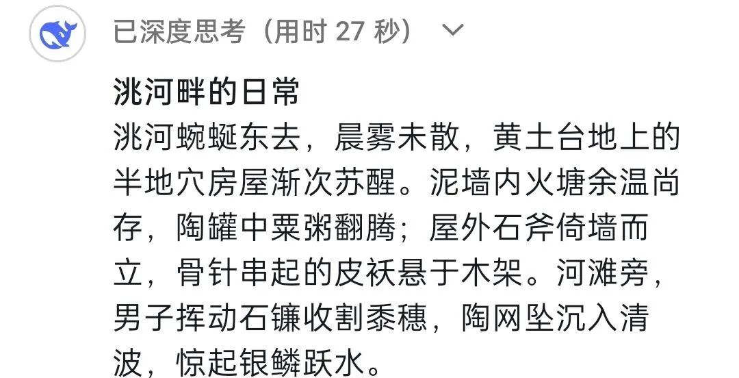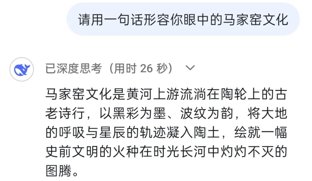 DeepSeek:馬家窯文化作為人類文明長河中一顆璀璨的明珠,因最早發(fā)現(xiàn)于甘肅省臨洮縣馬家窯村而得名,它被認為是仰韶文化向西發(fā)展的延續(xù),它展現(xiàn)了黃河上游先民的創(chuàng)造力,更是史前人類與自然對話、與社會共生的見證。