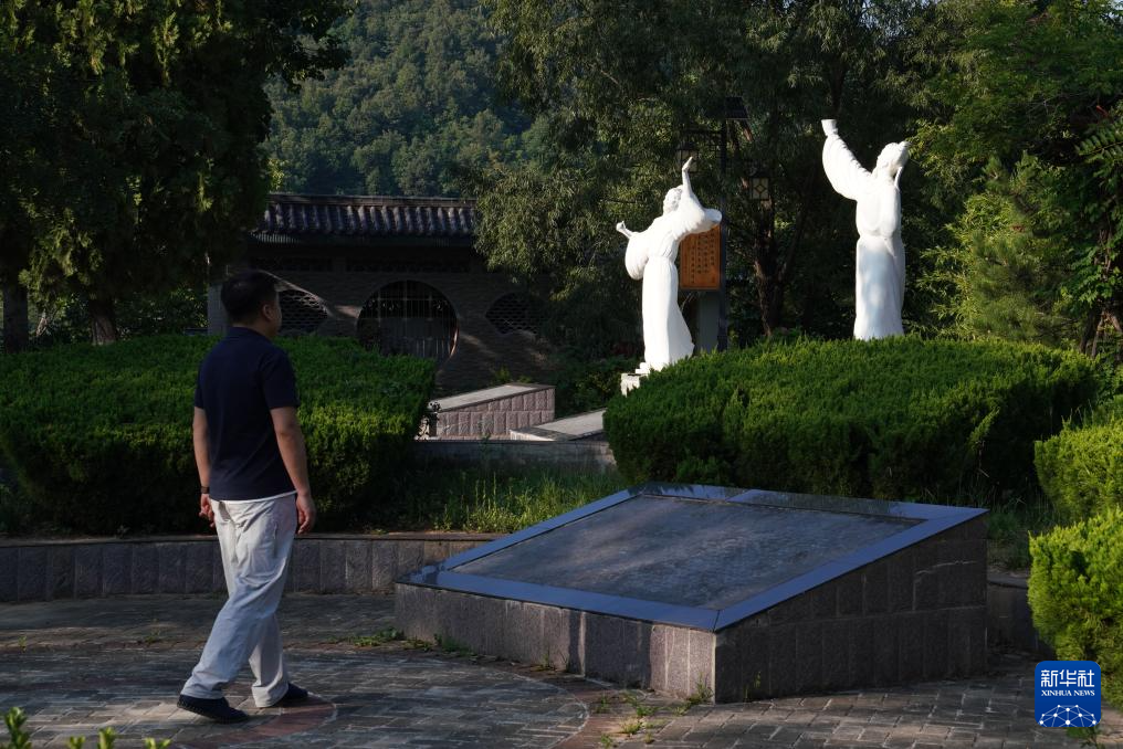 7月14日,在甘肅省隴南市徽縣大河店鎮(zhèn)青泥村,游客觀賞李白和杜甫的雕塑。新華社記者 馬寧 攝