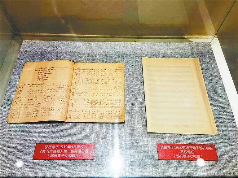 記者在《黃河大合唱》展覽館看到,展出的鄔析零1939年4月手抄《黃河大合唱》第一版簡譜總譜,字跡小而工整,旁邊還陳展著幾頁五線譜紙,那是冼星海從巴黎帶回來,自己舍不得用,送給鄔析零的,而鄔析零也沒舍得用,就留存到了現(xiàn)在。這,都是歷史的見證。