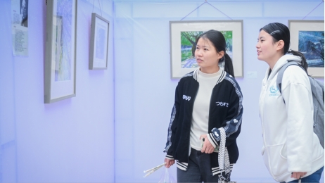 該校學(xué)生在認真品鑒精品畫作