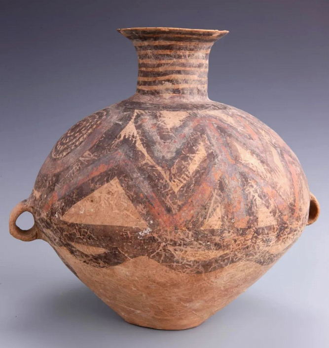 彩陶蛙紋壺,新石器時(shí)代馬家窯文化馬廠類型,高42厘米,口徑13.1厘米。壺泥質(zhì)紅陶,口外侈,薄唇,球形腹,小平底,腹部兩側(cè)對(duì)稱置雙系。于橙紅色陶衣上以黑彩描繪變形蛙紋。圖案線條流暢,富于變化,與造型協(xié)調(diào)一致。據(jù)科學(xué)測試,馬家窯文化馬廠類型彩陶的年代約為公元前2200~前2000年。變形蛙紋作為馬家窯文化馬廠類型彩陶上常見的裝飾紋樣之一,體現(xiàn)了遠(yuǎn)古人們對(duì)于繁衍生殖的渴望。青蛙產(chǎn)下許多卵,孵出許多蝌蚪,正是繁衍旺盛的象征。