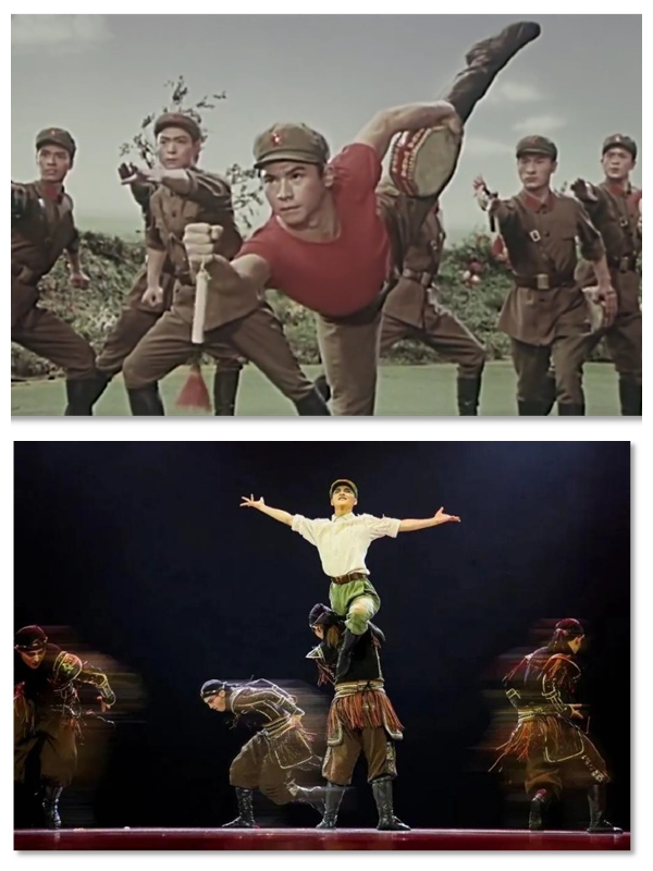 此外,配樂與道具也為作品增添了更多細(xì)節(jié),使作品更加貼近生活,富有表現(xiàn)力。作品打破配樂從屬地位的作品創(chuàng)作模式,以聲樂結(jié)構(gòu)化推進(jìn)作品節(jié)奏和情感變化:開端音樂急促緊張,契合人馬對抗的故事情節(jié);隨后連長亮相指導(dǎo)小戰(zhàn)士,音樂也隨之沉穩(wěn)變緩;而在小戰(zhàn)士成功馴服戰(zhàn)馬后,舞蹈由獨舞過渡到男子群舞,配合鑼鼓齊鳴、節(jié)奏密集的歡快旋律,渲染馴馬成功的歡慶畫面。道具也融入作品中,配合配樂、舞蹈,形成三位一體的功能設(shè)計。張雍指出:“作為道具的鑼鼓具有三層作用——既作為戰(zhàn)士用來馴馬的道具,也作為舞者用來表演的道具。與此同時,鑼鼓自身發(fā)出的聲音作為一種韻律配合著舞蹈的節(jié)奏,也作為一種力量增強著舞蹈的力量。”配樂和道具都超越了在舞蹈作品中的從屬地位,以更具功能性的方式參與到作品創(chuàng)作中,最大限度地發(fā)揮了非語言符號的表達(dá)魅力,塑造了極具生活感的官兵日常,作品得以長盛不衰。