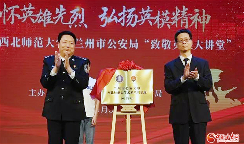 活動中,王立朝代表蘭州市公安局,接受了劉仲奎代表西北師范大學捐贈的8幅蘭州公安烈士畫像,向學校頒發(fā)收藏證書,并一同為“蘭州公安文聯(lián)西北師范大學藝術培訓基地”揭牌。蘭州公安竇勇烈士之子竇永杰、李鋼烈士之子李俊杰分別追憶父親的英雄事跡。“全國優(yōu)秀人民警察”、城關分局直屬大隊大隊長張子劍,“全國公安機關愛民模范集體”代表、市局刑警支隊電信網絡案件偵查大隊民警陳薈文分別作分享報告。學校師生和市公安局民輔警代表共同演繹詩朗誦《是誰》、合唱《少年壯志不言愁》,以多種形式緬懷英烈,致敬英雄。