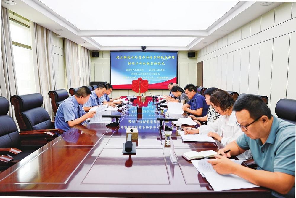 民勤縣檢察院邀請(qǐng)法院、人社、司法、工會(huì)、婦聯(lián)等部門(mén)單位召開(kāi)座談會(huì),共同簽訂《關(guān)于建立新就業(yè)形態(tài)勞動(dòng)者勞動(dòng)權(quán)益保障協(xié)同工作機(jī)制的意見(jiàn)》(2024年6月7日拍攝)。